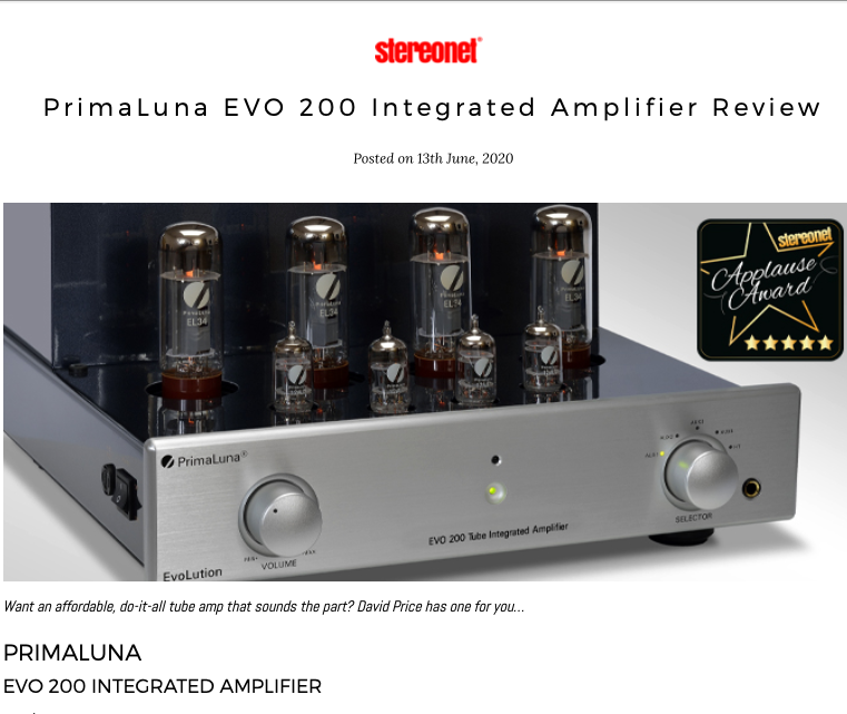 “I had much enjoyment playing with the Evo200. This amplifier offers a detailed and fast sound with excellent mid-band and secure top with a beautiful patina that simply makes music human again . . . PL are renowned for value for money and this product carries this forward . . . this is a lot of tubes and music.”